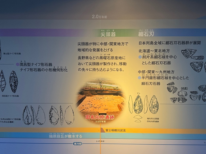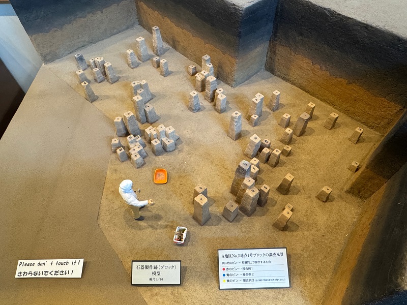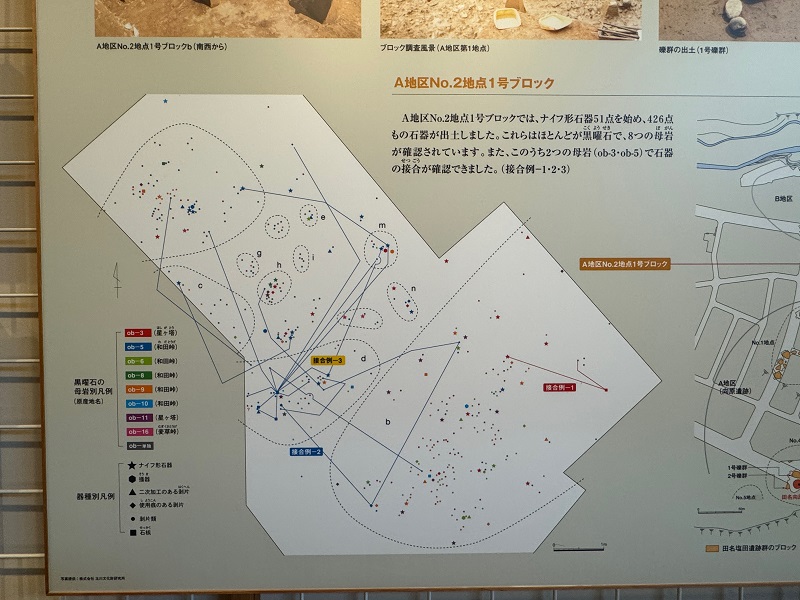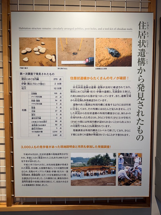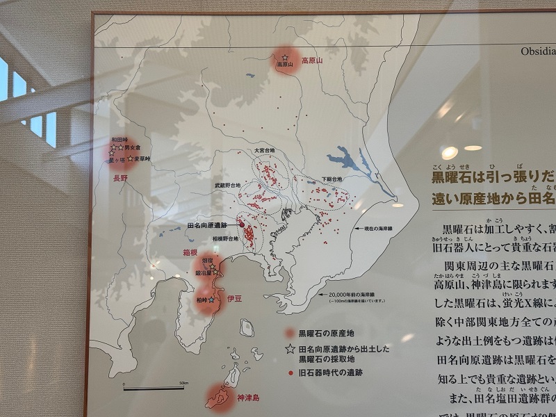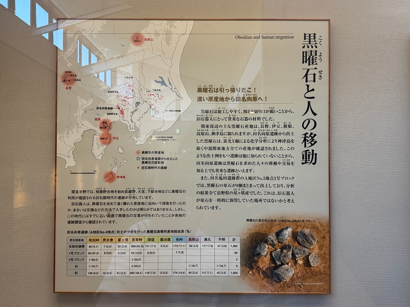 驚くべきは、ここ田名向原遺跡から出土した黒曜石の産地です。なんと中部・関東地方の「すべての産地」のものが確認されているとのこと!これほど多様な出土例は他に類を見ず、当時の人々の移動や交易の広さを物語る第一級の資料といえます。