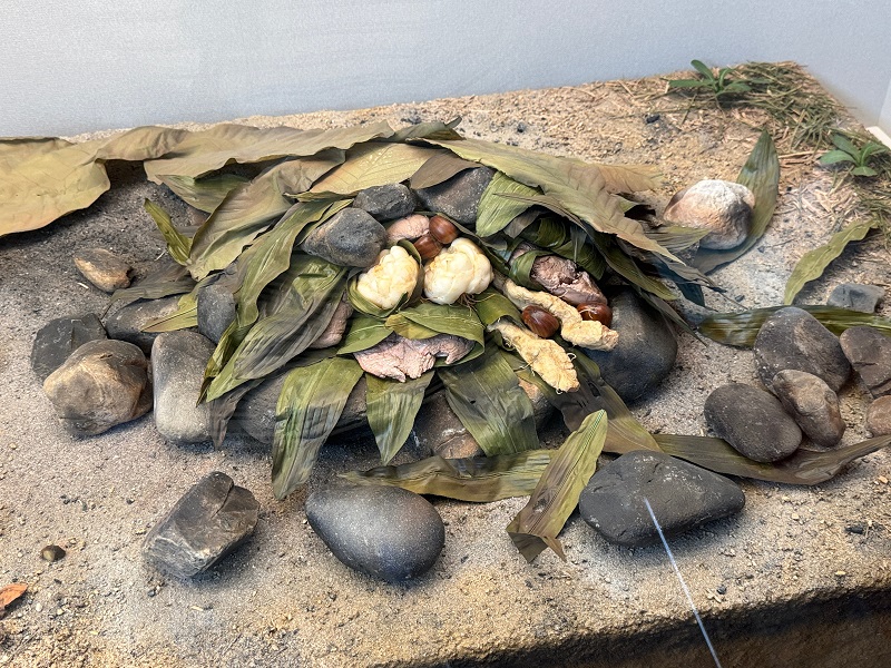 遺跡を調査すると、「礫群(れきぐん)」と呼ばれる焼けた石のまとまりが見つかることがあります。これらは食材の加熱調理に使われたと考えられており、例えば大きめの葉で包んだ肉などを石の上に置き、蒸し焼きのようにして食べていたと推測されています。