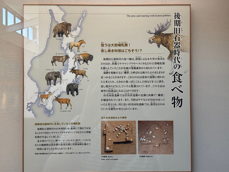 旧石器時代の人々は、植物の果実などを採集するほか、狩猟によってナウマンゾウやヘラジカといった大型哺乳類を捕らえていたことが各地の発掘調査から判明しています。