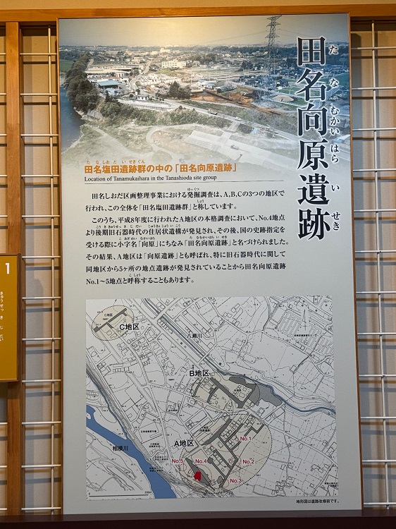 田名塩田(たなしおだ)土地区画整理事業に伴う発掘調査は、A・B・Cの3つの地区で行われ、これら全体を総称して『田名塩田遺跡群』と呼んでいます。