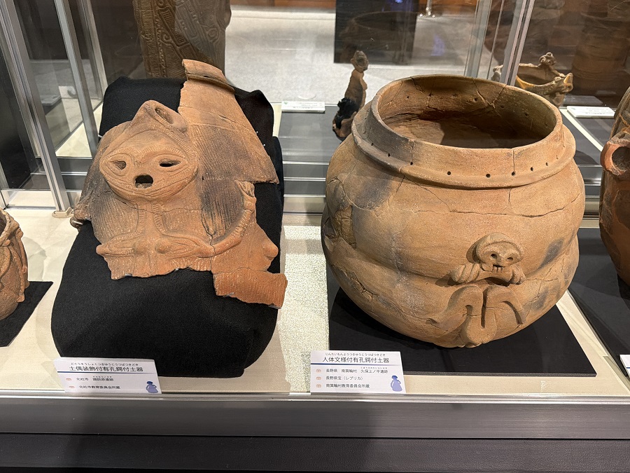 神像筒形土器は、富士見町にある「藤内遺跡」から出土した縄文時代中期の土器で、円筒形の胴に神を象ったレリーフが抱きつくような造形が特徴、祭祀に使われたと考えられています。
