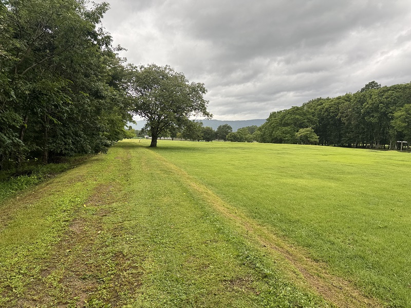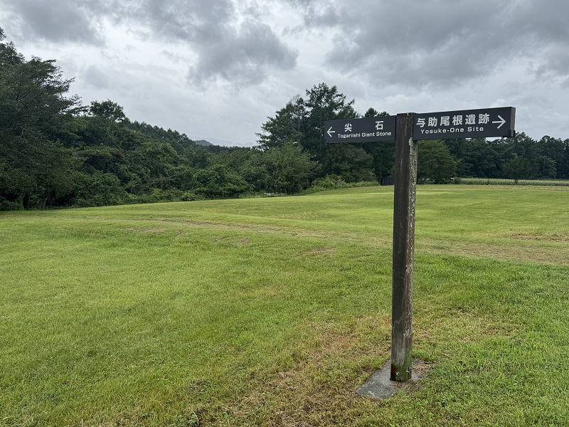 『尖石』がある場所へは、考古館の目の前にある道路を渡り、右側に広がる原っぱのような道を歩いて向かいます。その途中で、尖石遺跡の案内看板が見えてきます。