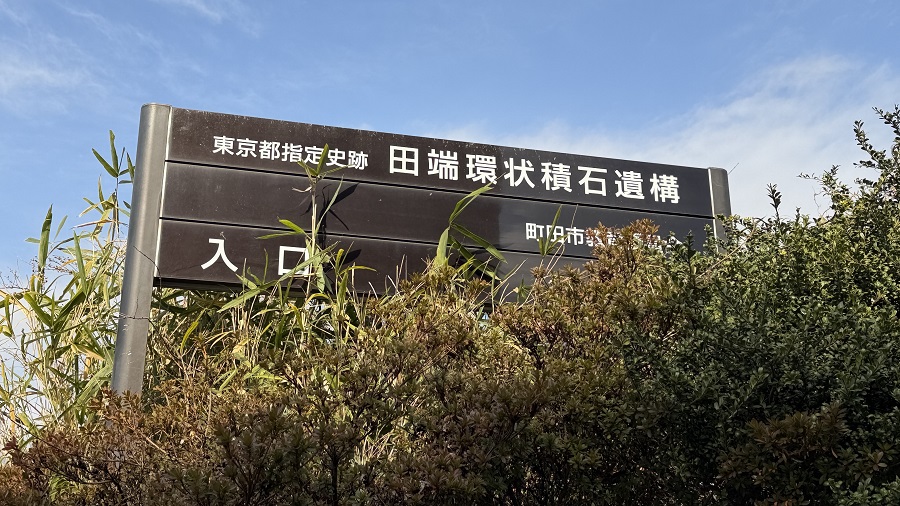 ちなみに、ここの道路をそのまま真っ直ぐ進んでいくと、頭上に『町田市田端環状積石遺構』という看板が見え、そこが「田端・田端東遺跡」の入り口になっています。