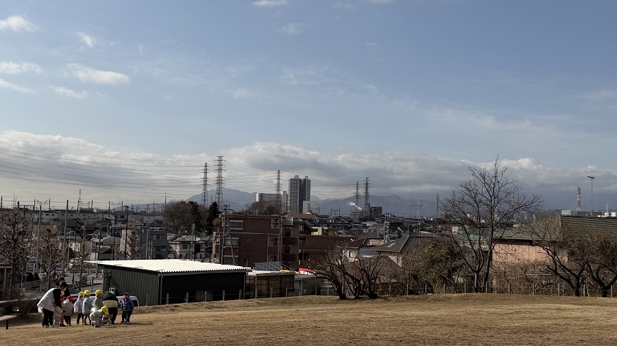 「皆さんは何をしに行くのかな」と思いながら一緒に入っていくと、園児たちは田端遺跡の芝生で元気に遊び始めました。