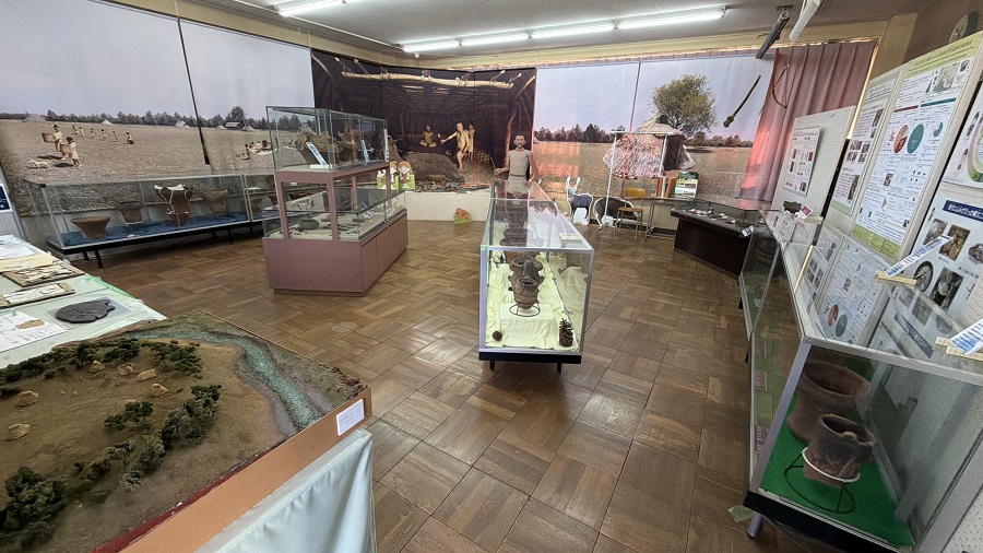 下野谷遺跡の土器たちが並ぶ展示室