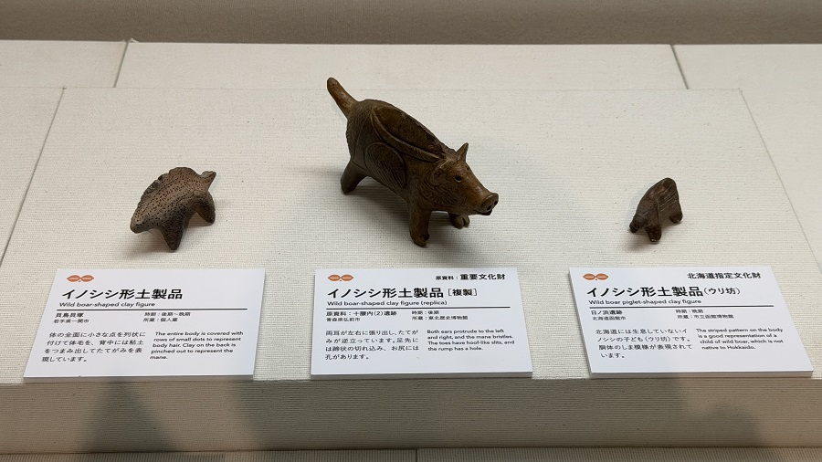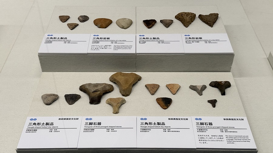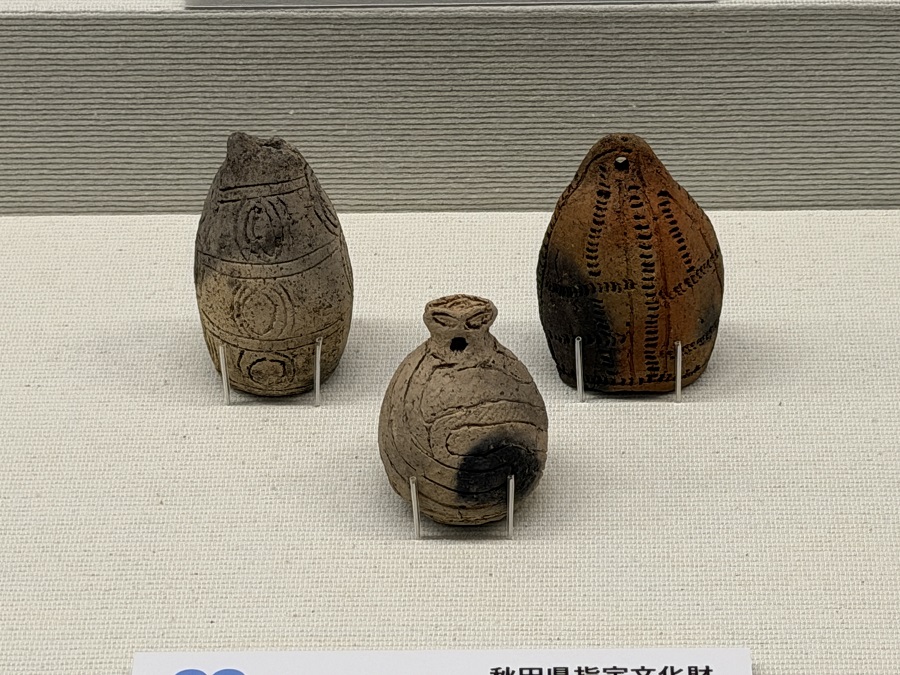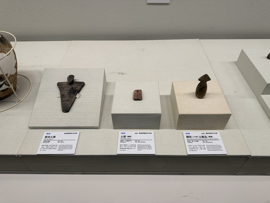 写真の左側にある板状土偶は、秋田県北秋田市にある「伊勢堂岱遺跡(いせどうたいいせき)」、真ん中の土版は、秋田県鹿角市にある「大湯環状列石」、右側にあるかわいいイカ形土製品は、北海道森町にある「鷲ノ木遺跡」から出土したものたちです。