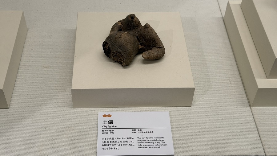 大きな乳房と膨らんだお腹から妊娠を表現した土偶。右腕はアスファルトで付け直した跡があります。通称「縄文のぼいん」