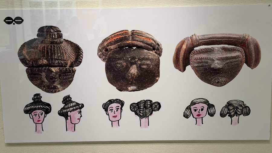 土偶の頭は当時の髪型をモデルにしていると考えられています。土偶で表現されている上を結い上げる行為は、その長さが邪魔になること以外に、年齢や所属を示す意味があったとする説があります。