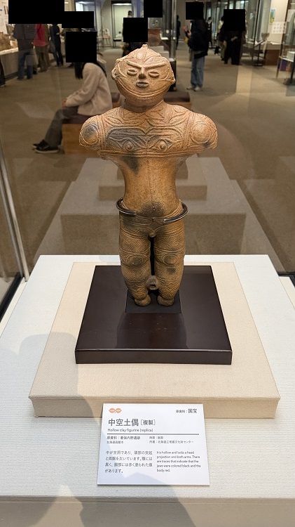1975年に地元の女性によって偶然掘り出されました。中が空洞になっていることから「中空土偶」と名付けられています。両腕と頭の飾りが欠損しており、X線CT解析により、これらの部位は壊れやすく作られていたことがわかりました。はじめから壊すことを目的として作られた可能性が指摘されています。また、この土偶はやや右上を向いて直立し、右脚を前に出し、右肩を後ろに引いた姿勢です。これは歩行のようすを表現しているという説があります。(中空土偶も函館市縄文文化交流センターで見ることができます)